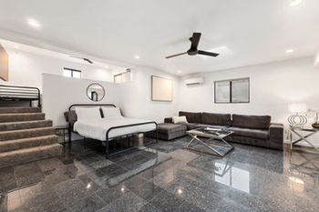 Open, spacious floor plan with lofted bedroom and big screen TV. Full kitchen with all the basics, dining table, and big comfy couch.